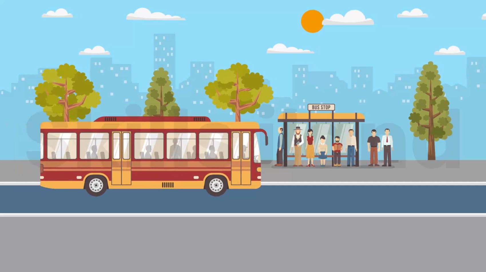 The bus arrives from one direction, picks up passengers from the bus stand, and continues its journey to the other side.. Designed in Adobe After Effects 2020, the animation is in 1920 x 1080 resolution.